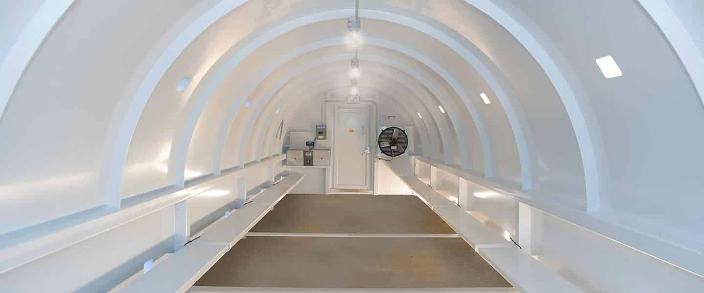 Our Quonset-style above-ground community and commercial tornado shelters are available in 10-foot-wide, 12-foot-wide and in the same widths as side-by-sides. Rated to withstand an EF5 tornado, these portable storm shelters are prefabricated from quarter-inch cold rolled steel at our factory in Thomasville, Georgia and shipped to the installation site and set by crane onto a massive steel-reinforced concrete foundation.